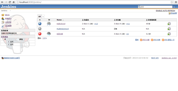 完成这些基本配置后,点击保存按钮,保存配置,返回任务界面,点击立即构建,Jenkins将会自动重源代码服务获取代码,并编译,并显示构建状态。