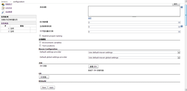 在系统配置页面,可以配置JDK、MSBuild、源代码控制等。几乎所有的插件安装后有需要配置的都会在这里呈现。