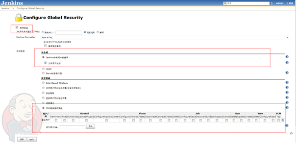 首先要启用安全,在安全域中选择Jenkins专有用户数据库,并选择允许用户注册。在授权策略选项中选择项目矩阵授权策略。设置好这些基本属性后,就是添加用户。