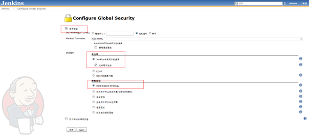 进入系统管理,系统设置,如下图所示:"安全域"选择使用Jenkins专有用户数据库,可以在初始化的时候勾选"允许用户注册";"授权策略"选择使用"Role-Based Strategy"。