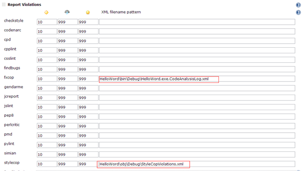 在Report Violations配置页面,设置要展示的文件。我闪这里设置FxCop、StyleCop分析所产生的文件。值得注意的是,StyleCop所产生的文件是在obj\Debug目录下。