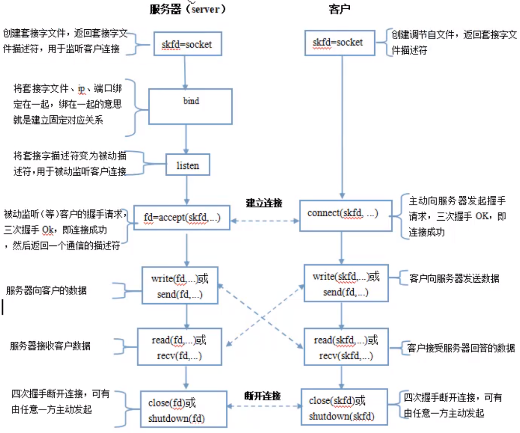 服务器调用read(recv)和write(send),收发数据,实现与客户的通信