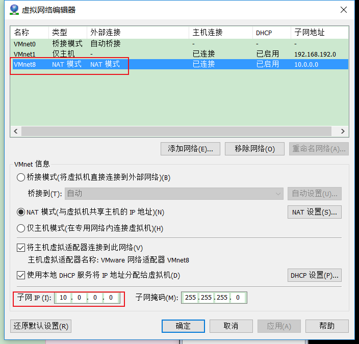 默认网关一般都是子网的最后一位为2的网址,例如10.0.0.0的默认网关为10.0.0.2,192.168.101.0子网的默认网关为192.168.101.2,需要跟step1的虚拟机子网配置配置对应: