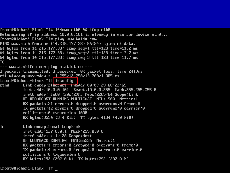 使用命令:ifdown eth0 && ifup eth0 重启网卡。