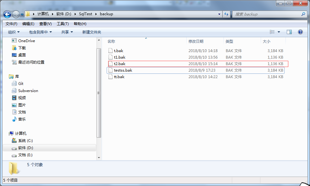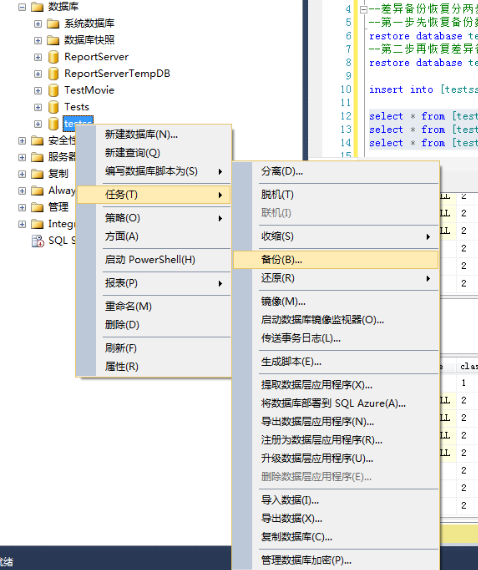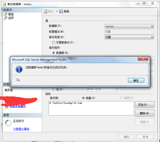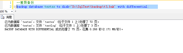 示例:backup database testss to disk='D:\SqlTest\backup\t3.bak' with differential;