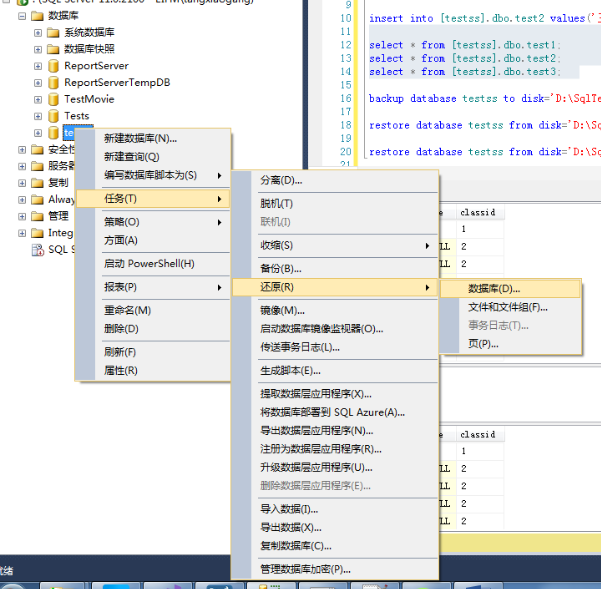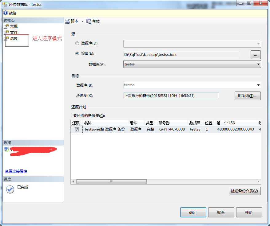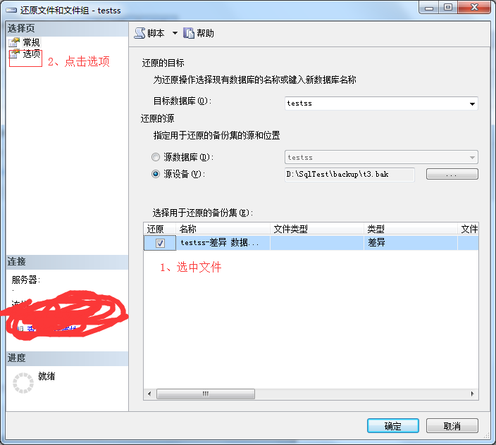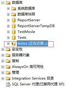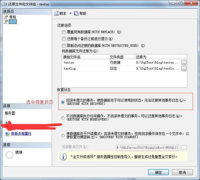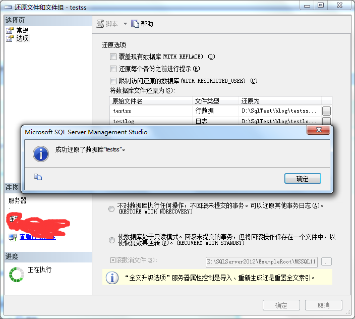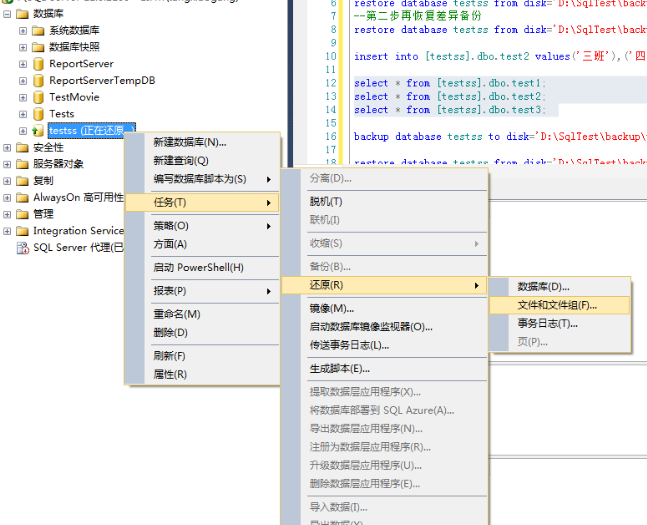 示例:第一步先恢复备份数据库:restore database testss from disk='D:\SqlTest\backup\testss.bak' with norecovery ;