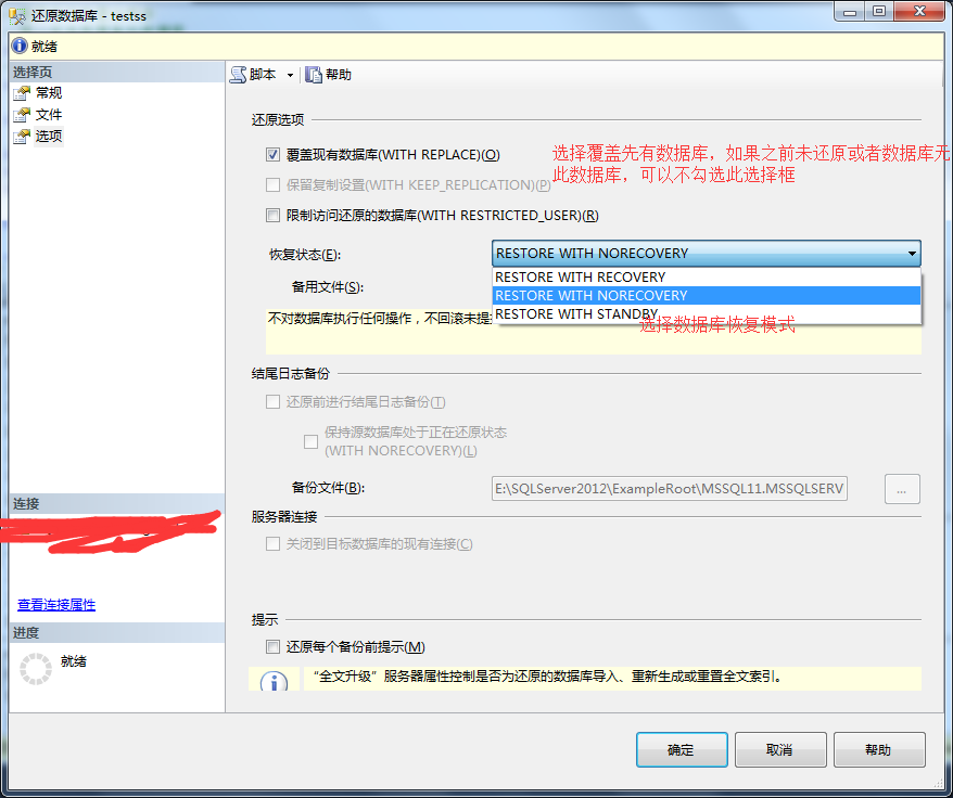 6、覆盖现有数据库可不勾选-》选择数据库恢复模式为设置为NORecorvery。