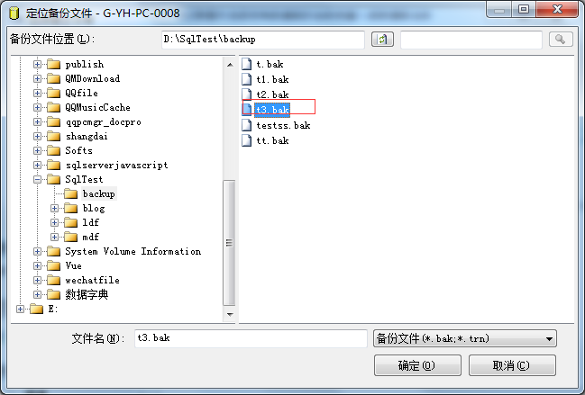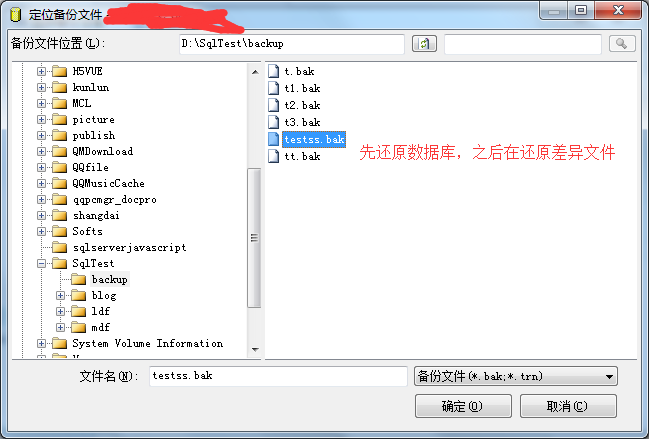 4、在定位备份文件弹出框-》选择要还原的差异文件-》点击确定。
