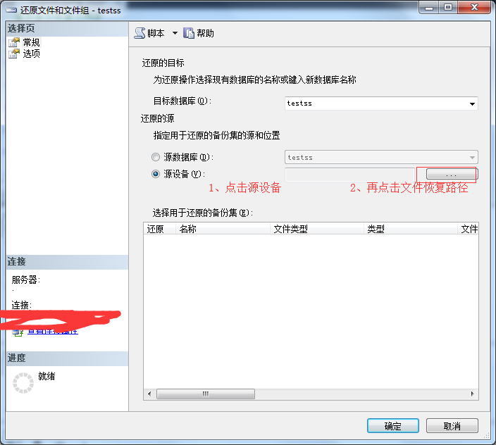 2、在还原文件和文件组弹出框-》选择设备-》选择文件还原路径。