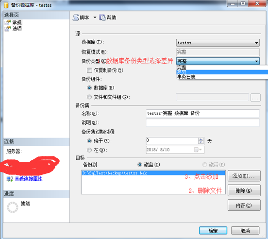 2、在备份数据库弹出框中-》选择备份类型为差异-》然后删除系统生成的目标文件-》然后点击添加。