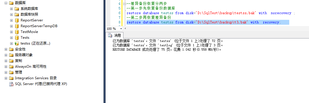 第二步再恢复差异备份:restore database testss from disk='D:\SqlTest\backup\t3.bak' with recovery;