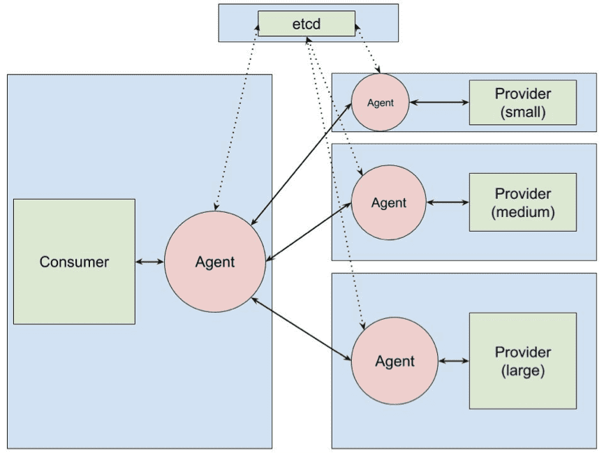 Provider 是服务提供者,Consumer是服务消费者,Consumer 消费 Provider 提供的服务。Agent 是 Consumer 和 Provider 服务的代理,每个 Consumer 或 Provider 都会伴随一个共生的 Agent。etcd 是注册表服务,用来记录服务注册信息。从图中可以看出,Consumer 与 Provider 之间的通讯并不是直接进行的,而是经过了 Agent 的中转。这看似多余的一环,却在 Service Mesh 的架构中扮演着举足轻重的角色。