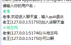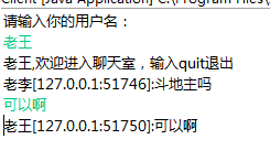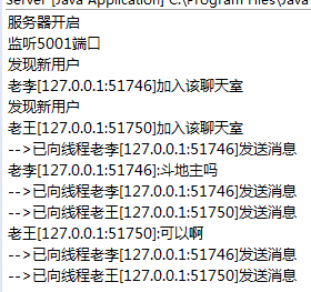 package com.cky.server; import java.io.BufferedReader; import java.io.IOException; import java.io.InputStreamReader; import java.io.PrintWriter; import java.net.ServerSocket; import java.net.Socket; import java.util.ArrayList; import java.util.List; public class Server { private List<ThreadServer> clients=new ArrayList<ThreadServer>(); public void startup() throws IOException { System.out.println("监听5001端口"); ServerSocket ss=new ServerSocket(5001); while(true){ Socket socket=ss.accept(); System.out.println("发现新用户"); Thread st=new Thread(new ThreadServer(socket)); st.start(); } } public class ThreadServer implements Runnable{ private Socket socket; private BufferedReader br; private PrintWriter out; private String name; private Boolean flag=true; public ThreadServer(Socket socket) throws IOException { this.socket=socket; br=new BufferedReader(new InputStreamReader(socket.getInputStream())); out=new PrintWriter(socket.getOutputStream(),true); String str=br.readLine(); name=str+"["+socket.getInetAddress().getHostAddress()+":"+socket.getPort()+"]"; System.out.println(name+"加入该聊天室"); send(name+"加入该聊天室"); clients.add(this); } private void send(String message) { for (ThreadServer threadServer : clients) { System.out.println("-->已向线程"+threadServer.name+"发送消息"); threadServer.out.print(message); threadServer.out.flush(); } } private void receive() throws IOException { String message; while(flag=true) { message=br.readLine(); if(message.equalsIgnoreCase("quit")) { System.out.println("用户"+name+"退出了"); out.println("quit"); out.flush(); clients.remove(this); flag=false; } System.out.println(name+":"+message); send(name+":"+message); } } @Override public void run() { try { while(flag=true) { receive(); } } catch (IOException e) { e.printStackTrace(); }finally { try { socket.close(); } catch (IOException e) { e.printStackTrace(); } } } } public static void main(String []args) throws IOException { Server server=new Server(); System.out.println("服务器开启"); server.startup(); } }