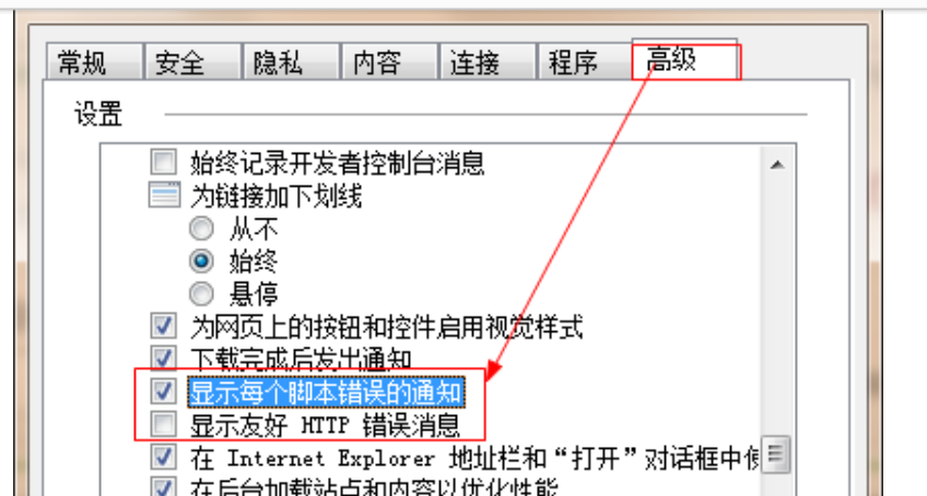 浏览器可以查看到错误代码的方法:"显示每个脚本错误的通知"打钩,"显示友好HTTP错误信息"不打勾!
