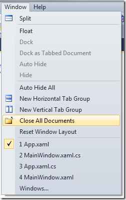 在 VS2010 中,关闭文档窗口的按钮从窗口的右边被移到了每一个 Tab 上,使得我们可以一次关闭一个文档窗口。