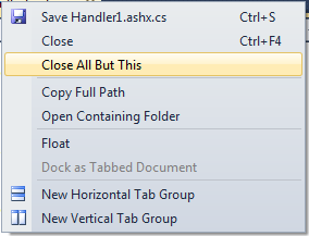 #2 在文档窗口的 Tab 上点击鼠标的右键,选择 Close All But This,可以关闭除了当前窗口之外的窗口。但是不包括浮动的窗口。