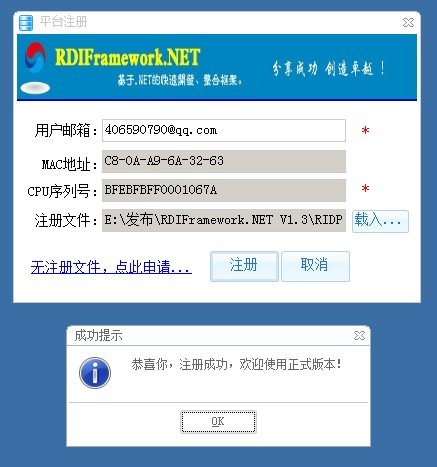 实现软件的注册功能方法很多,最需要考虑的就是不能轻易的让使用者破解,在这里,我就谈谈“.NET快速开发整合框架(RDIFramework.NET)”中平台注册功能的实现方法。在RDIFramework.NET中,注册功能主要方法就是对计算机唯一硬件信息进行RSA数字签名达到软件注册和保护的功能,该方法实现简单,安全性相应较高。