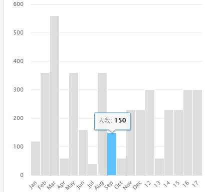 <script src="~/Scripts/jquery-2.1.4.min.js"></script> <script src="~/Scripts/highcharts.js"></script> <div id="chart"></div> <script type="text/javascript"> //定义一个Highcharts的变量,初始值为null var highCharts = null; //定义highCharts的布局环境 //布局环境组成:X轴、Y轴、数据显示、图标标题 var oOptions = { chart: { renderTo: 'chart', //设置显示的页面块 type: 'column' //设置显示的方式 }, title: { text: '' //设置null则不显示标题 }, plotOptions: { column: { pointPadding: 0, borderWidth: 1, groupPadding: 0, shadow: false } }, xAxis: { tickWidth: 0, //labels: { // enabled: false //禁止X轴的标题显示 //}, type: 'category', categories: ['Jan', 'Feb', 'Mar', 'Apr', 'May', 'Jun', 'Jul', 'Aug', 'Sep', 'Oct', 'Nov', 'Dec'] }, yAxis: { title: { text: '' }, //labels: { // enabled: false //禁止Y轴的标题显示 //}, }, legend: { enabled: false }, credits: { enabled: false }, tooltip: { formatter: function () { return '<span>' + this.series.name + '</span>: <b>' + this.y + '</b>'+ '<span>分数范围</span>: <b>' + (this.x + 10) * 10 + "-" + (this.x + 11) * 10 + '</b>' }, } }; $(function () { highCharts = new Highcharts.Chart(oOptions); highCharts.showLoading(); $.ajax({ url: '/home/getJosn2', type: 'POST', success: function (Data) { Data = eval("(" + Data + ")"); var Series = { name: "人数", data: Data.rows, color: '#ddd' }; highCharts.addSeries(Series); } }); highCharts.hideLoading(); }); </script>