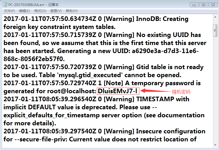 找到“[Note] A temporary password is generated for root@localhost:”XXXXXX这一行,冒号后面即为生成的随机密码