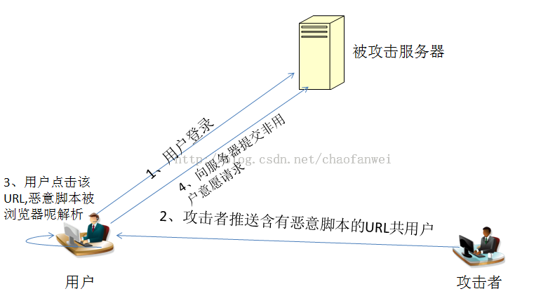 常见的XSS攻击类型有两种,一种是反射型,攻击者诱使用户点击一个嵌入恶意脚本的链接,达到攻击的目的,如下图所示: