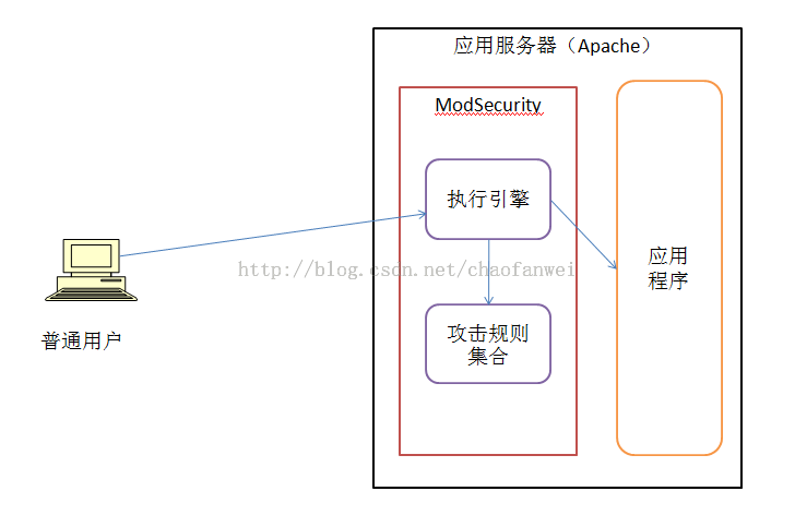 ModSecurity采用处理逻辑与攻击规则集合分离的架构模式。处理逻辑(执行引擎)负载请求和相应的拦截过滤,规则加载执行等功能。而攻击规则集合则负责描述对具体攻击的规则定义、模式识别、防御策略等功能。处理逻辑比较稳定,规则集合需要不断针对漏洞进行升级,这是一种可扩展的架构设计。