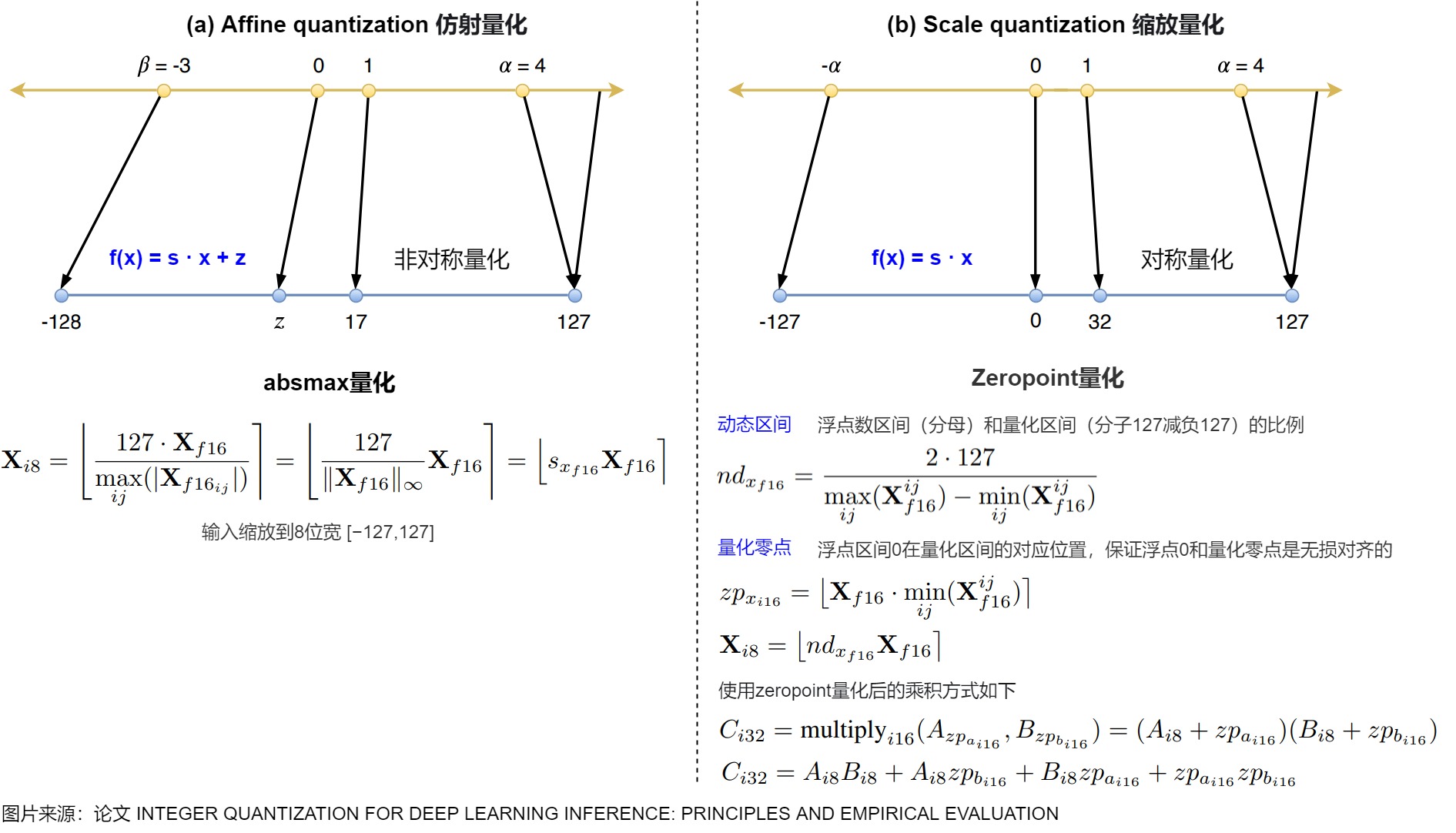下图(a)表示Absmax量化,b)表示Zeropoint量化。[β,α]分别表示区间最小和最大值。