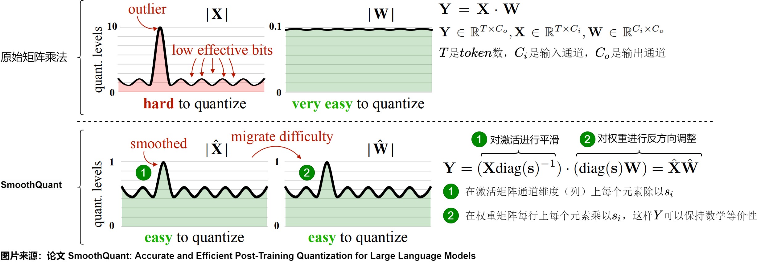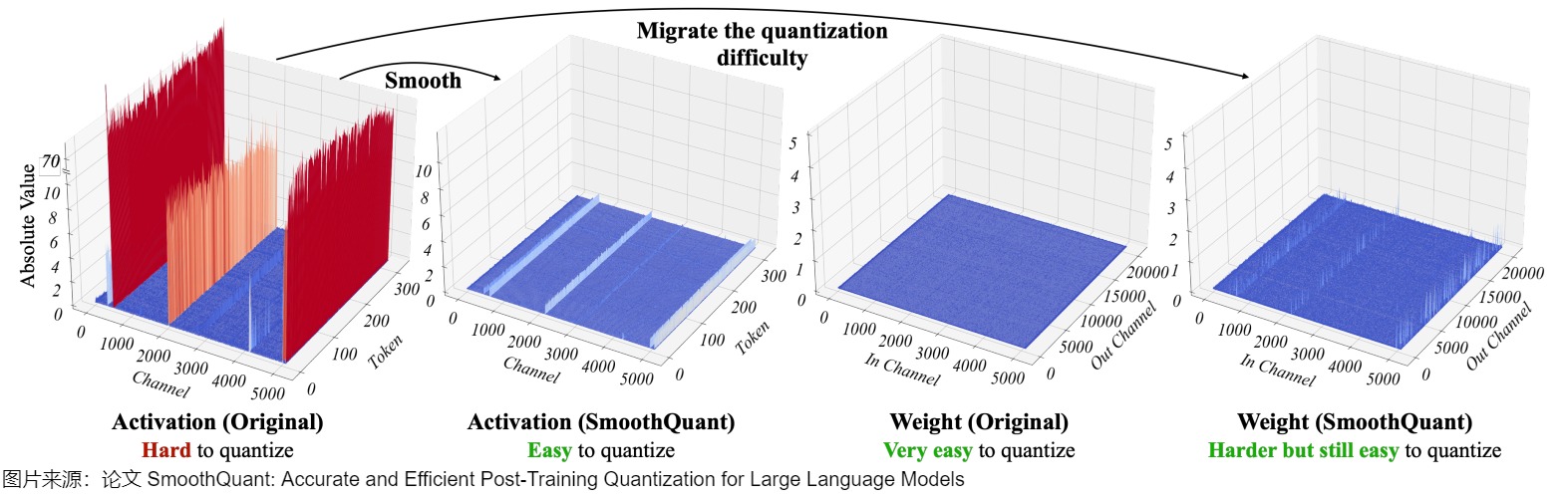 | SmoothQuant | W8A8 | 提出了一种按通道缩放的方法,将高精度量化的复杂性从激活转移到权重,借此平滑激活异常值。 |