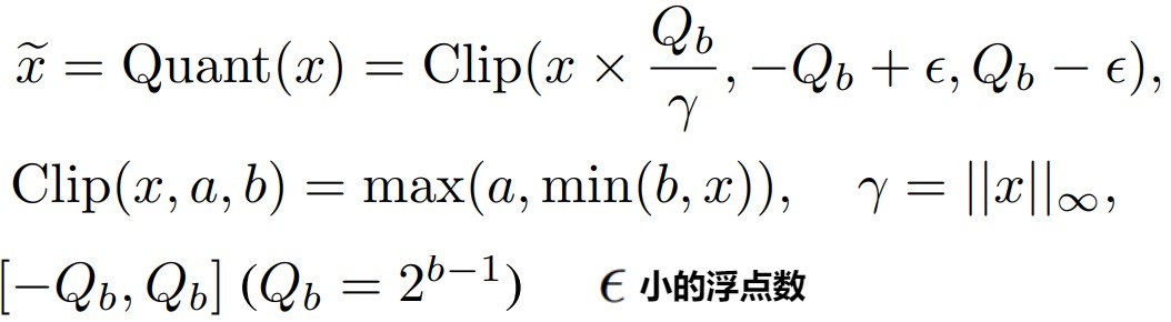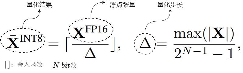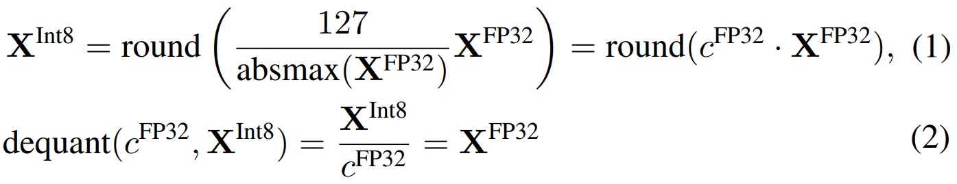- Absmax量化:除以绝对值的最大值乘127从而把输入缩放到8位宽 [−127,127] , ⌊⌉ 表示取最近邻整数,记\(s_{xfl16}\)为缩放系数。该方法即为缩放量化。