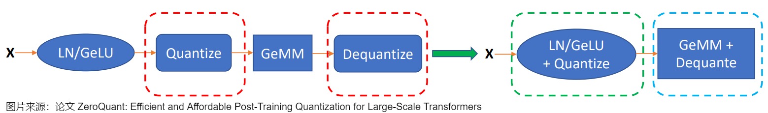 为了解决这个问题,ZeroQuant 构建了一个高度优化的推理后端,用于Transformer模型 token-wise 量化。例如,ZeroQuant 的推理后端采用算子融合技术将量化算子与其先前的算子(如Layer Norm)融合,以减轻 token-wise 量化的数据移动成本。类似地,在将最终 FP16 结果写回到下一个 FP16 算子(如:GeLU)的主存之前,使用权重和激活量化 scales 缩放 INT32 accumulation,可以减轻不同 GeMM 输出的反量化成本。