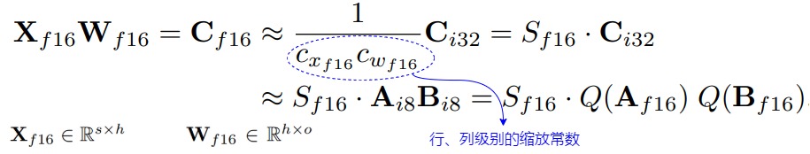Vector-wise Quantization具体为:将矩阵乘法看成一系列向量(独立的行与列)的内积,可对每个内积使用不同的归一化常数。对于给定输入 \(X_{f16}\)和权重 \(W_{f16}\),输入为FP16的int8矩阵乘法,我们为输入 \(X_{f16} \in R^{s×ℎ}\) 的每行、权重 \(W_{f16} \in R^{ℎ×o}\) 的每列分配不同的缩放常数 \(c_{xf16}\) 和 \(c_{wf16}\) ,反量化时把量化的内积除以缩放常数积的倒数。对于整个矩阵乘法,这相当于外积\(c_{xf16}⊗c_{wf16}\)的反规范化(denormalization)。并且,可以在下一个操作前,通过反归一化恢复矩阵乘法的输出。