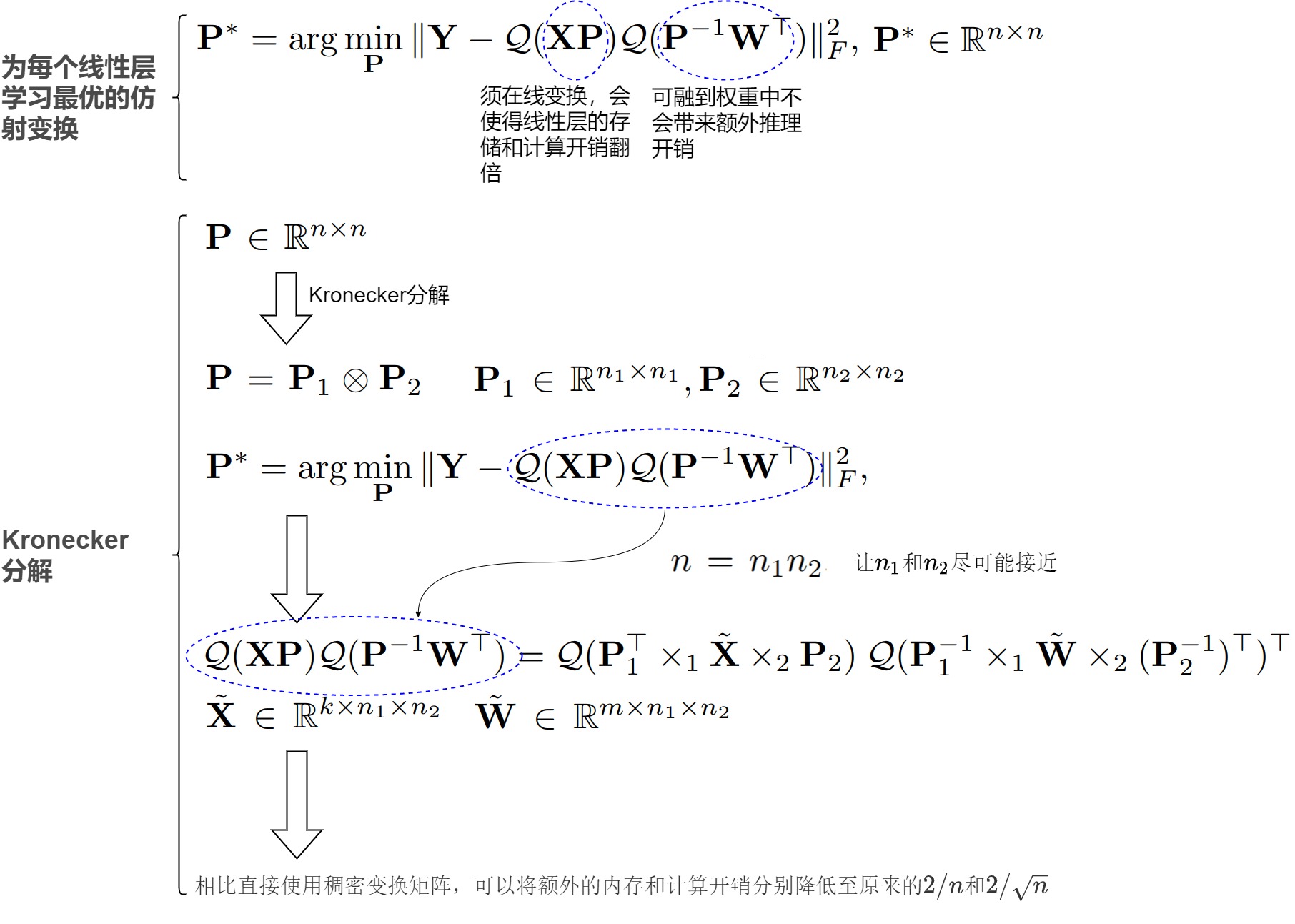 作者发现激活中的异常值集中在一小部分通道中,且outliers占据的维度很少(不到1%)。于是作者思考,是否可以把异常值单独分出来处理。剩下的部分只使用一个缩放值就可以得到很好的结果了。另外,作者认为,其实换个角度来看,矩阵乘法可以看成是左边矩阵的行和右边矩阵的列在做点乘。如果我们把左边矩阵按行做量化,右边矩阵按列做量化,那么就可以得到更加精确的量化值,可以进一步得到更高的精度。