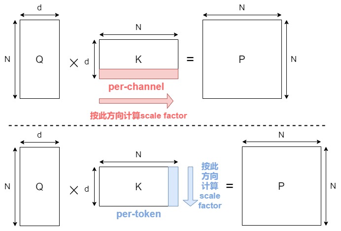 我们以注意力机制量化为例来继续分析。假如对K 做 channel-wise 量化,是可以避免不同 channel 之间的值共享scale factor。然而这在注意力机制计算中会有问题。这是因为在进行矩阵乘法 \(QK^T\) 后,得到的结果矩阵的维度是 N × N。如果我们对 K 进行了per-channel 量化(上图上方,总共 d 个channel,每个 channel 包含 N 个元素),每个通道都有一个独立的scale factor,总共是 d 个 scale factor。在反量化(dequantization)时,我们需要将量化后的结果乘以对应的scale factor,而\(QK^T\) 的结果矩阵的维度是 NxN,没有 d 的通道维度直接对应,无法使用 K 的通道维度的缩放因子进行正确的反量化。因此,注意力乘法中,对于每个矩阵,我们只能沿着公共维度进行量化(如上图下方)。根据这个简单的原则,Attention 中四个矩阵可以量化的组合如下。