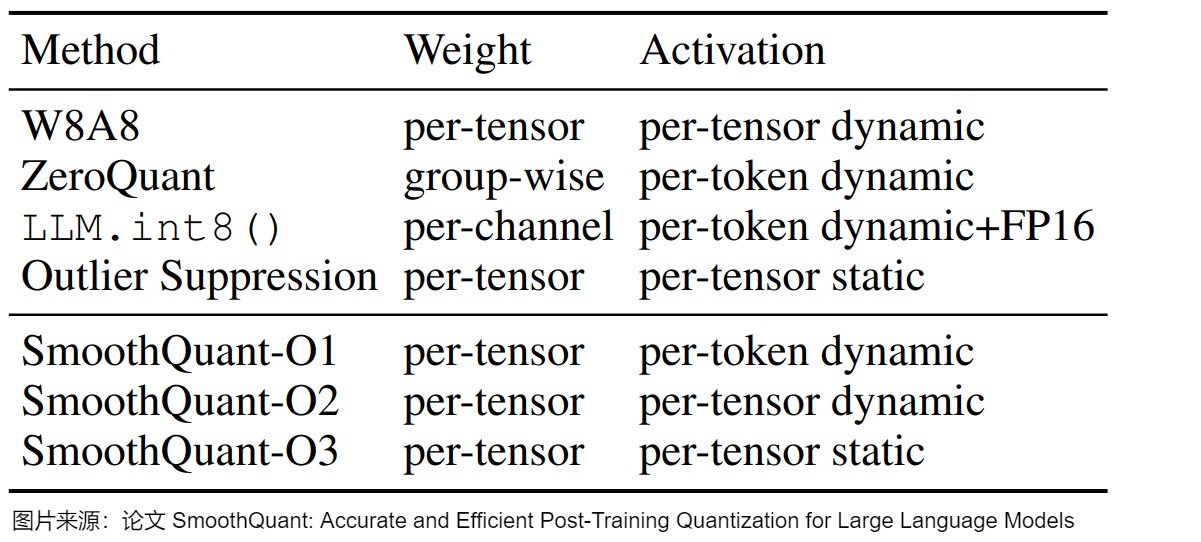 | ZeroQuant | W8A8 | 应用Dynamic per-token activation 量化和分组 weight 量化。 |