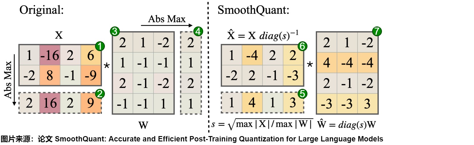 - 引入平滑因子s来平滑激活异常值,将量化难度从激活等价转移到权重上;