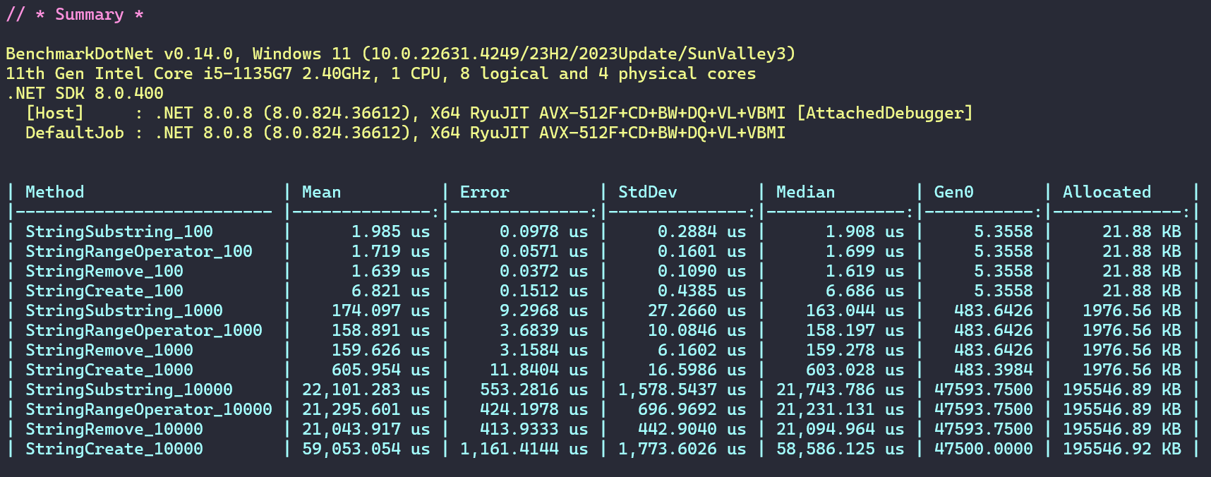 Span 是一个轻量级的、非托管的视图,用于表示连续的内存块。它可以直接操作栈上的内存。AsSpan方法可以通过指定起始索引和长度,直接在原字符串上获取到目标字符串视图,然后转成字符串返回,代码实现如下: