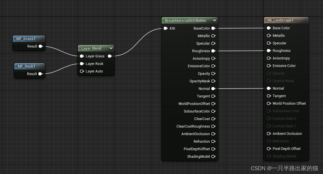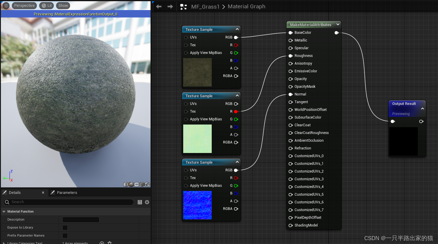 Material Function,将对应贴图放入。右键搜索make,加入MakeMaterialAttribute,将三张素材转化为材质对应属性。