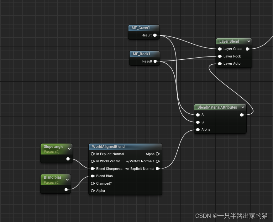 1、在母材质中添加BlendMaterialAttributes材质混合节点。并为其添加WorldAlignedBlend世界对齐混合。