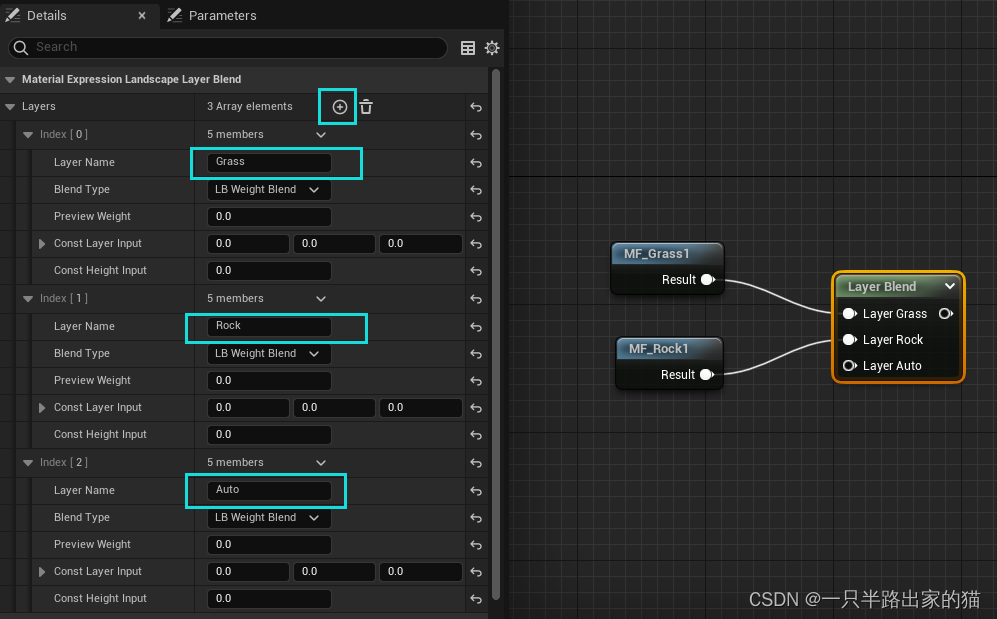 4、新建的layerblend是空的,需要手动为其添加layer,并将之前创建好的材质方法挂上去。