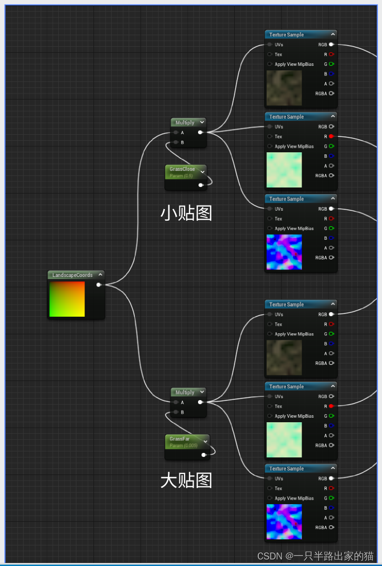 这篇UE5学习笔记详细介绍了如何涂抹地形、创建地形贴图笔刷、实现远近贴图混合以及根据地形倾斜度进行材质混合,深入探讨了UE5中地形和地表材质的高级技巧。