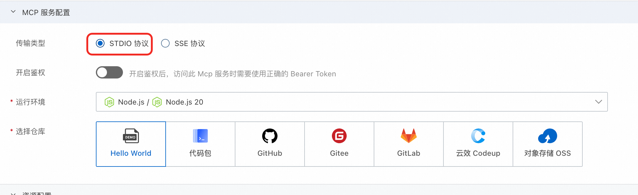 通过FunctionAI,可以配置MCP服务的协议类型。当配置STDIO协议时,部署后会自定生成SSE访问地址,函数计算会启动SSE代理,将SSE请求转发到STDIO服务上。