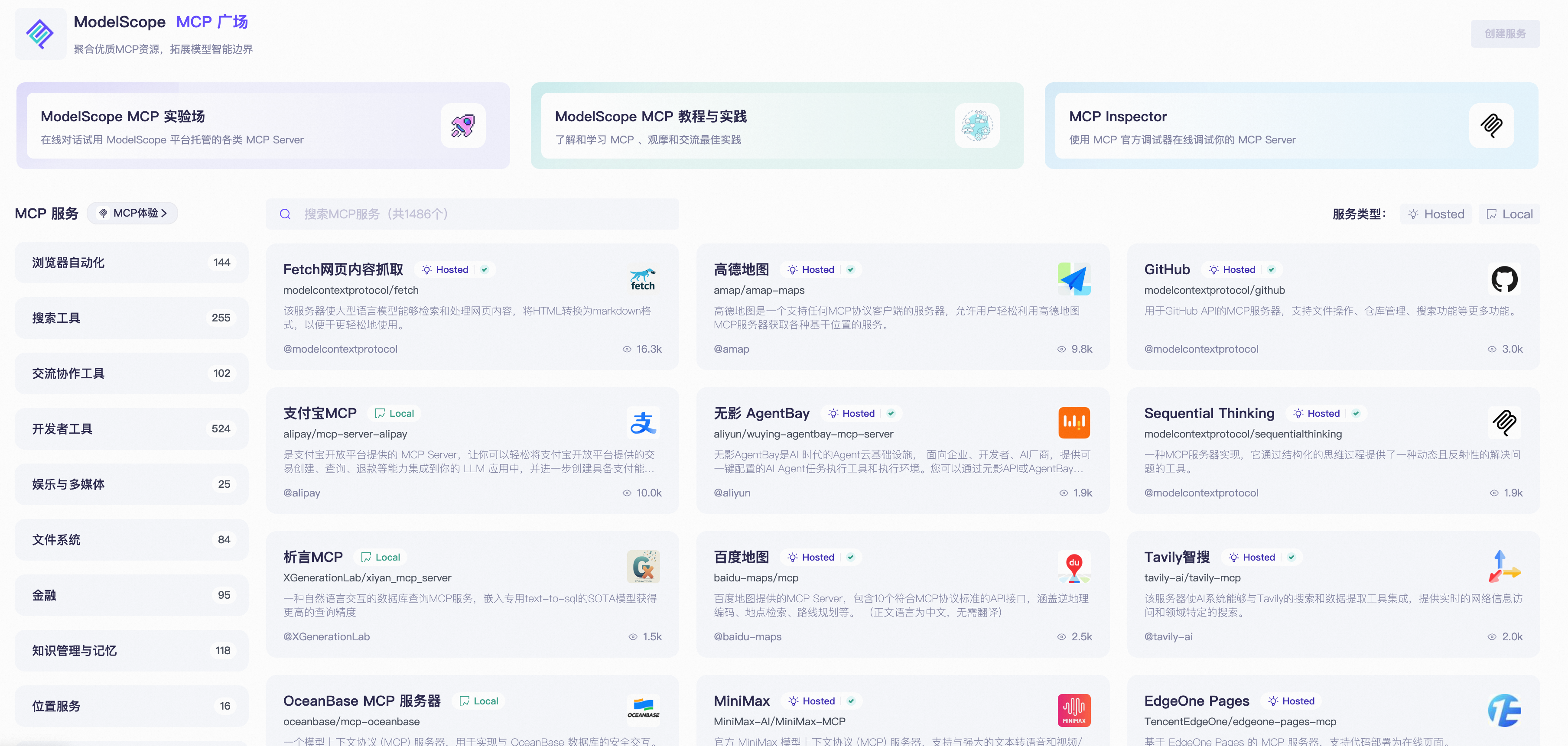 近期,中国第一AI开源社区魔搭(ModelScope)推出全新MCP广场,上架千余款热门的 MCP 服务。从当下火热的高德地图、网页抓取再到独家的支付宝,开发者/机构可以查看近1500种MCP的功能与应用场景,并通过MCP实验场直接上手使用。魔搭的加入无疑对国内 MCP 的发展开启了加速键。