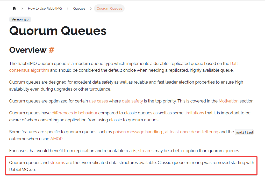 ❝注意:如上所述,官方文档明确指出,RabbitMQ 4.0完全移除了classic队列的镜像(mirroring)功能,quorum队列取代classic队列,成为默认队列类型。