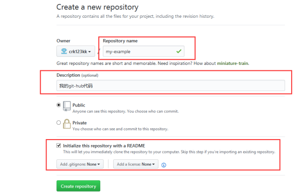 登录你的github,然后创建一个New repository,起个名称dome(名称随你开心的改),勾选 initialize this repository with a README,如下图,然后点击create repository。