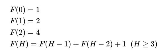 根据平衡二叉树定义可知,若二叉树左子树高度为 ,则右子树高度最少也要是h-1,方能满足平衡二叉树的平衡特性。以F(H)表示高度为H的平衡二叉树的最少节点个数,若二叉树不是空树则有: