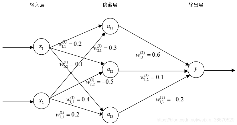 输入层的取值x1 = 0.7 和 x2 = 0.9。从输入层开始一层一层地使用前向传播算法。首先隐藏层中有三个节点,每一个节点的取值都是输入层取值的加权和。下面给出a11取值的详细计算过程: