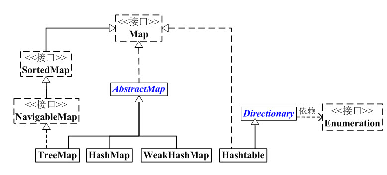 (07) Hashtable 虽然不是继承于AbstractMap,但它继承于Dictionary(Dictionary也是键值对的接口),而且也实现Map接口;因此,Hashtable的内容也是“键值对,也不保证次序”。但和HashMap相比,Hashtable是线程安全的,而且它支持通过Enumeration去遍历。