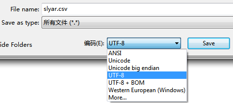 可以看到其实csv文档就是txt(即你可以使用自己的txt然后换个后缀名就行),只不过把各个字段之间用","分隔开了而已。既然它是txt文档,那么就涉及到了文件编码的问题!默认保存的文件编码是ANSI,如果你的数据库(数据表)使用UTF-8编码,那么一定要将这个csv文件另存为UTF-8格式!