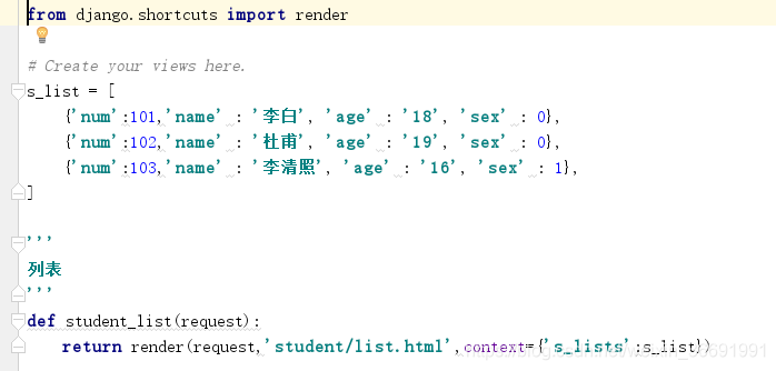看到图中的render中的参数context,它是一个字典,Django中是用字典来传值的。然后再模板中来处理。