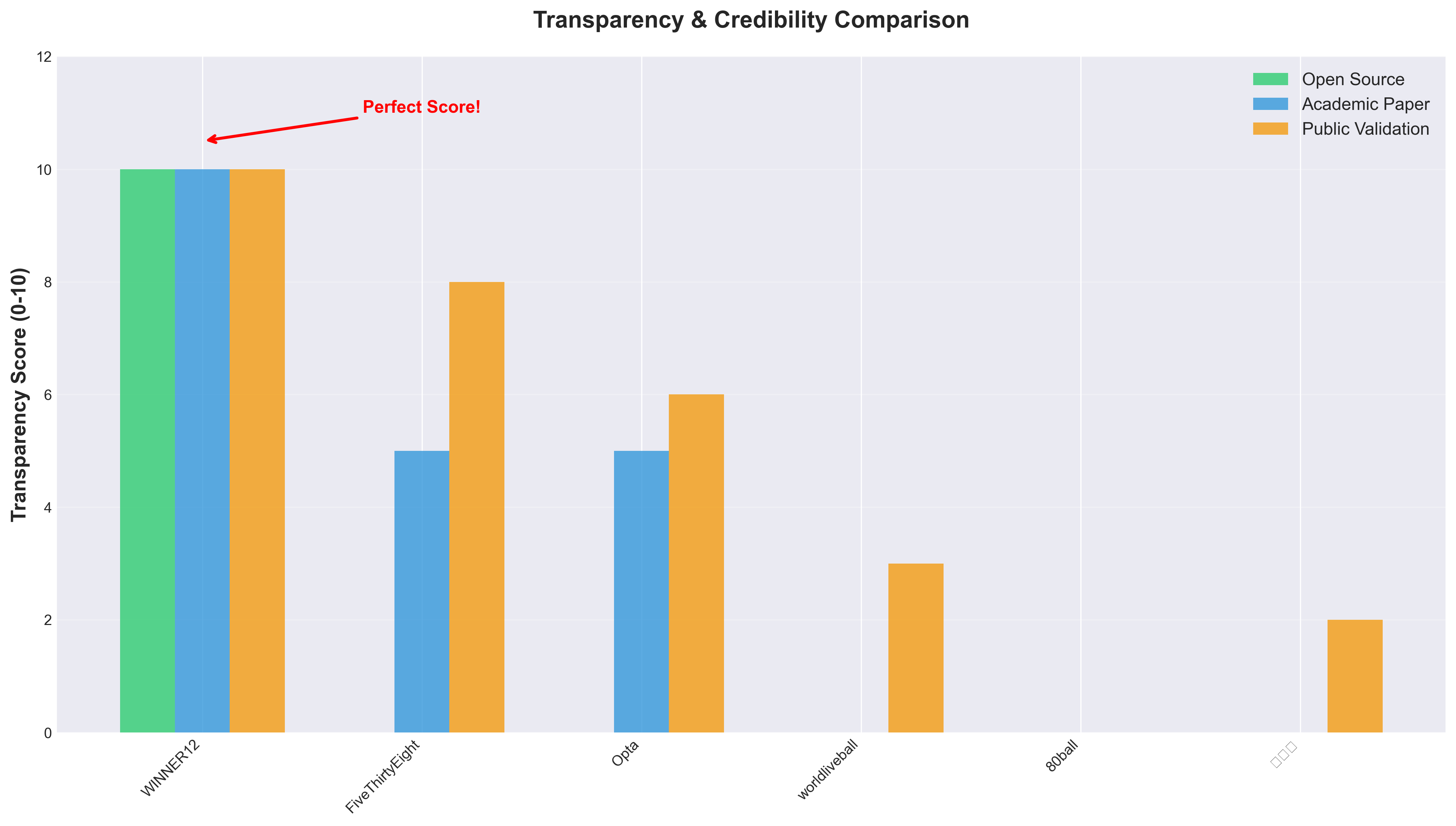 2.透明度是可信度的基石:在AI预测领域,"黑盒"模型正在逐渐失去用户的信任。像WINNER12这样选择开源和发表学术论文,或像FiveThirtyEight这样公开方法论的做法,更能体现其技术自信,也更值得用户信赖。