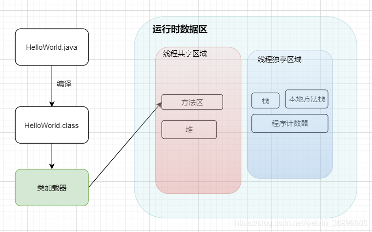我们知道Java对象的行为(函数,方法)是存储在方法区的,从下图可以看到,方法区的数据是由类加载器把编译好的class文件加载到jvm方法区的。所以我们可以得出简单思路是: